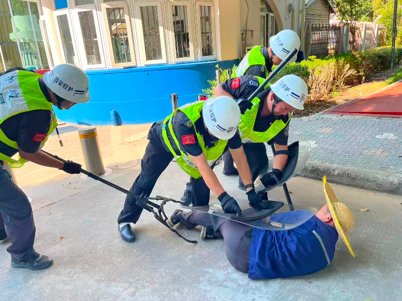 演练模拟“暴恐分子企图闯入校园”场景,一名志愿者扮演“歹徒”持凶器强行闯园,安保人员反应迅速,第一时间拿起防暴器械冲向“歹徒”阻拦。在紧密配合下,“歹徒”很快被压制,并被带离幼儿活动范围。与此同时,一名安保人员迅速按下一键报警系统,拨打报警电话。各工作组响应及时、处置专业,展现出良好的战术素养和协作能力。