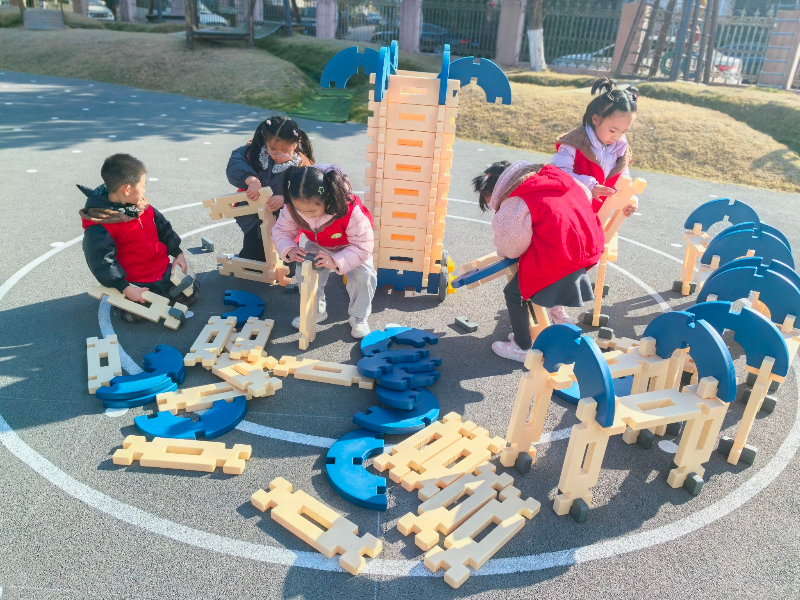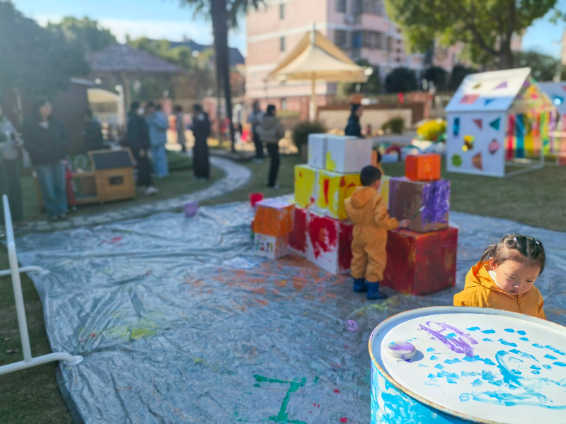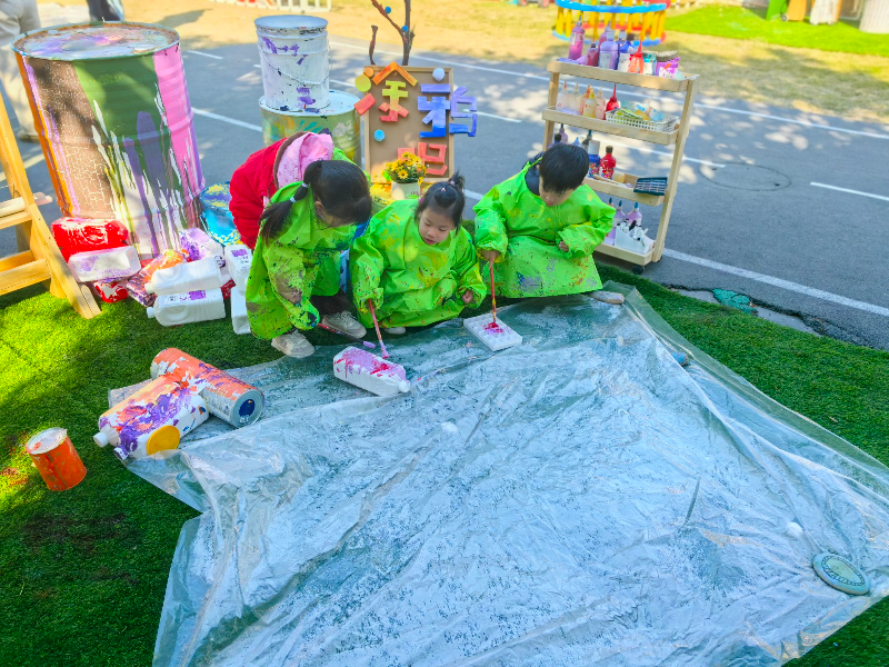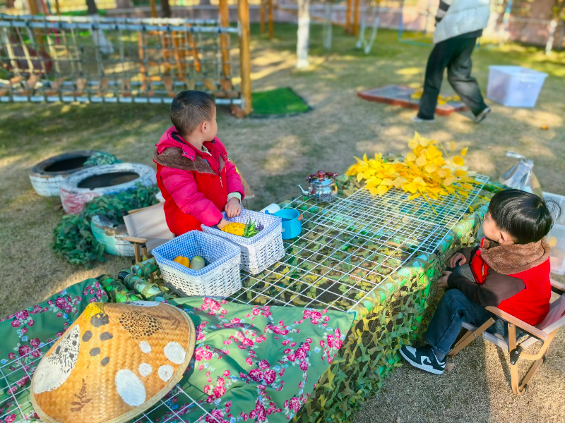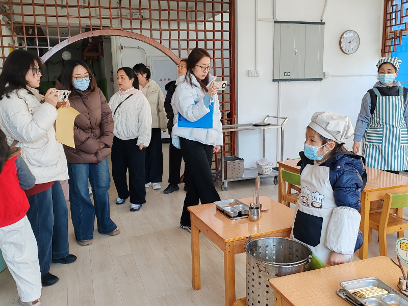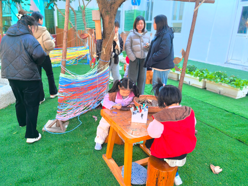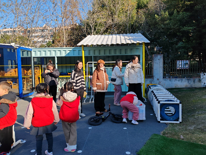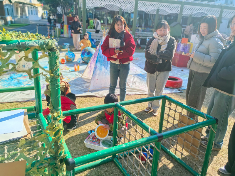 聚焦幼儿的个性化发展需求,户外场地中,托班与小、中、大班部分班级幼儿自由开展角色游戏、建构游戏,孩子们化身"小厨师""建筑师"等角色,在互动中提升语言表达与社会交往能力。与此同时,小中大班还呈现了的别化活动设计以及环境创设,全方位展示基础课程实践成效。