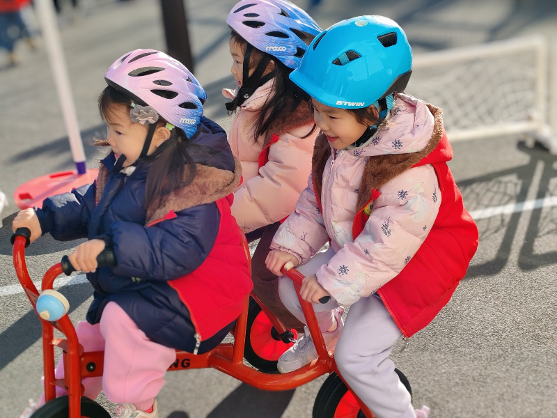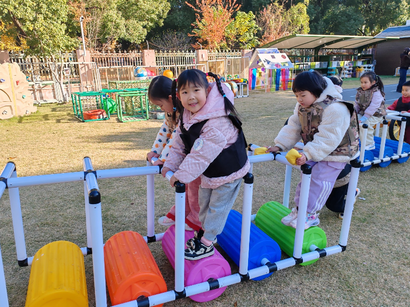 清晨的阳光洒满贝贝幼儿园的户外场地,户外运动展示环节,小、中、大班幼儿根据自身兴趣自主选择运动器械,在奔跑、跳跃、协作中展开多样活动。